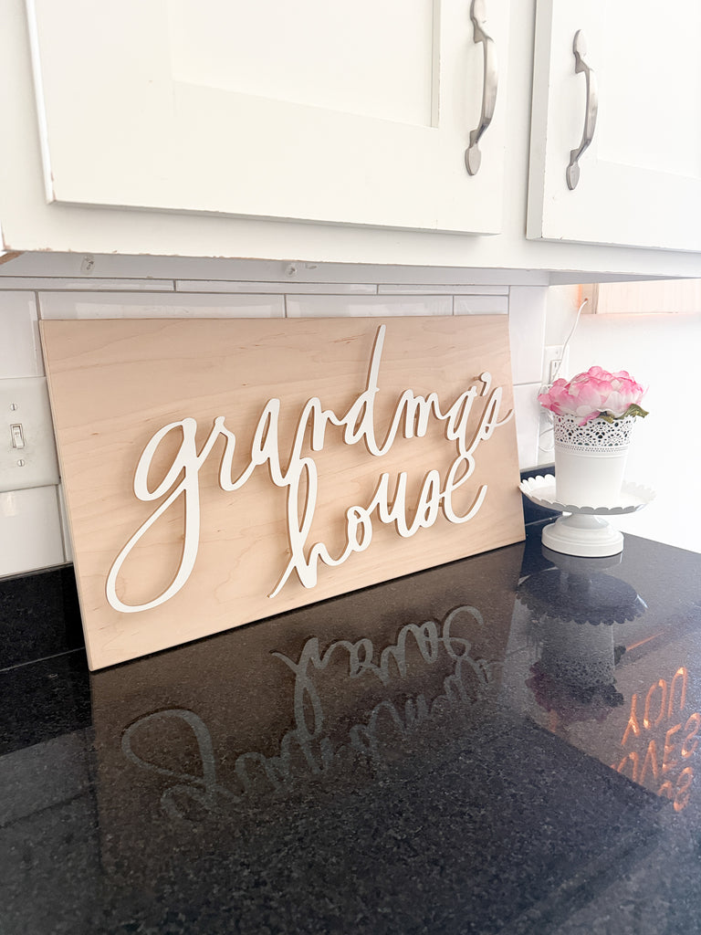 This 26x15 sign is made from a beautiful natural wood backer 1/2” thick. The words handwritten in Heidi Swapp’s signature font is cut from white melamine board and affixed to the backer by 2” pegs, so that it’s elevated off the backer creating fantastic dimension!